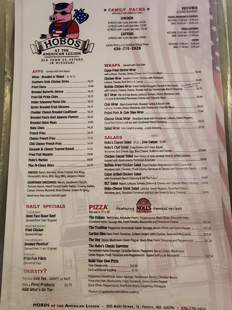 Located in St. Peters, MO, Hobos is a lively American bar known for its diverse menu and casual atmosphere. With options for takeout, delivery, and even catering, this spot offers something for everyone. Vegetarians will appreciate the many plant-based choices available, while families will enjoy the kid-friendly environment. The menu features a variety of appetizers like beer battered onion rings and fried dill pickle spears, along with hearty salads and flavorful chili. Don't miss out on the signature dishes like the BLT salad with chipotle mayo dressing or the buffalo fried chicken salad with homemade ranch. Whether you're looking for a laid-back lunch or a fun dinner spot, Hobos has you covered. Don't forget to try their delicious Hobo Chips and Nachos while enjoying the full bar, pool table, and Wi-Fi amenities.